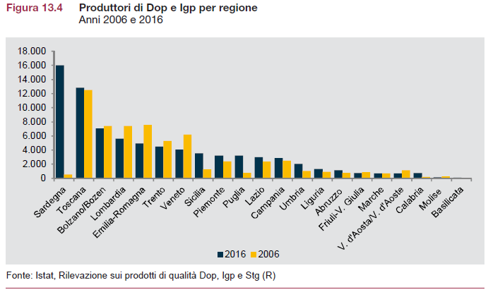 La Sardegna nell’ultimo decennio, ha avuto una fortissima crescita nel settore lattiero-caseario, divenendone il leader. Il numero dei produttori sardi è cresciuto da 593 nel 2006 a circa 16 mila nel 2016. Nel grafico sotto notiamo in giallo il numero di produttori nel 2006, in blu il numero di produttori nel 2016.