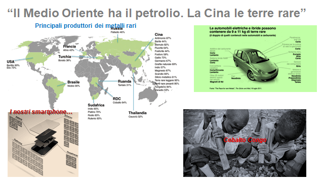L’estrazione e la raffinazione dei metalli rari (quelli fortemente utilizzati nella quarta rivoluzione industriale) richiedono processi molto inquinanti ed il loro riciclaggio è deludente. Sono necessarie 8,5 tonnellate di roccia per produrre un chilo di vanadio, sedici tonnellate per un chilo di cerio, cinquanta tonnellate per il gallio e duecento tonnellate per il lutezio. Un costo ambientale e umano immenso. Inoltre si pone un problema di carattere geopolitico.