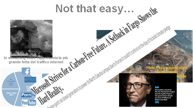 È vero: cinque ore di generazione via diesel per 1600 persone è “poca roba” se confrontato con gli ambiziosi obiettivi climatici di Microsoft. Ma il punto è chiaro: le aziende devono affrontare una, a dir poco monumentale sfida, per rispettare le loro promesse sul clima. Sopratutto se fanno affidamento ad altre aziende che forniscono loro di energia…