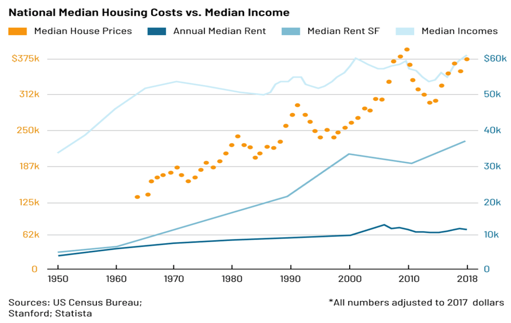 settanta anni di costante apprezzamento dei prezzi delle case, uniti ad una crescita ridotti dei salari reali, hanno creato negli Stati Uniti situazioni di disequilibrio. Nel grafico sotto basta confrontare la pendenza delle curva di crescita dei prezzi delle case e quelli dei redditi per capire di cosa stiamo parlando.