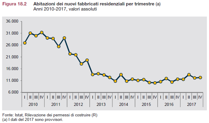 Notiamo il trend di richiesta delle nuove case negli ultimi sette anni. Dopo il minimo raggiunto nel 2016 abbiamo una lieve ripresa. Ma siamo ancora lontani dei livelli raggiunti in precedenza. Possiamo capire che a lungo termine lo scenario non è dei migliori, incrociando i trend demografici e sociali di lungo termine con quelli finanziari (tassi) di breve medio periodo. Sebbene quelli finanziari potrebbero essere ciclici quelli socioeconomici potrebbero non esserlo.